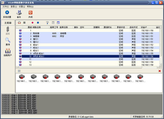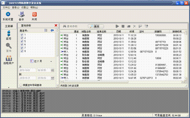 g. 系統(tǒng)設(shè)置、錄音查詢便利?;赪EB界面,支持遠(yuǎn)程設(shè)置,系統(tǒng)可設(shè)置多臺(tái)放音終端,具有聲卡的計(jì)算機(jī)或筆記本電腦都可以作為放音終端,無需特殊硬件,客戶端無需安裝任何特殊軟件。只要在IE地址欄輸入錄音服務(wù)器IP地址,放音終端即可對(duì)所有電話按錄音時(shí)間、電話號(hào)碼等信息進(jìn)行查聽。